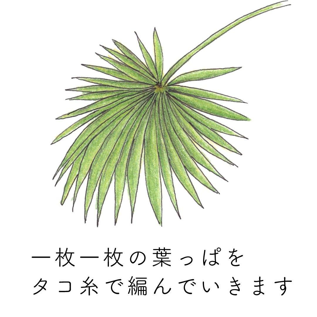 しっかりとした棕櫚の葉を見極めて収穫、時間をかけてゆっくりと乾燥させ、手作業で一つずつ丁寧に編み込んでいます。